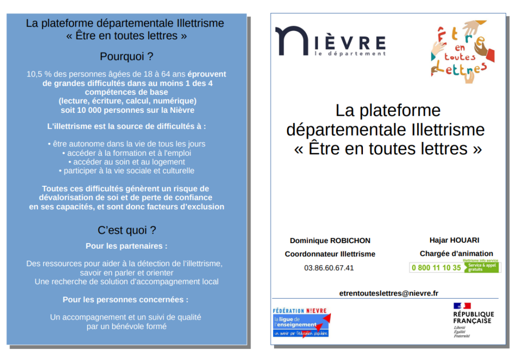 la plateforme départementale Illettrisme « Être en toutes lettres » dispose d’un numéro vert gratuit pour être jointe : le 0800 11 10 35, ainsi que d’une adresse mail dédiée : etreentouteslettres@nievre.fr