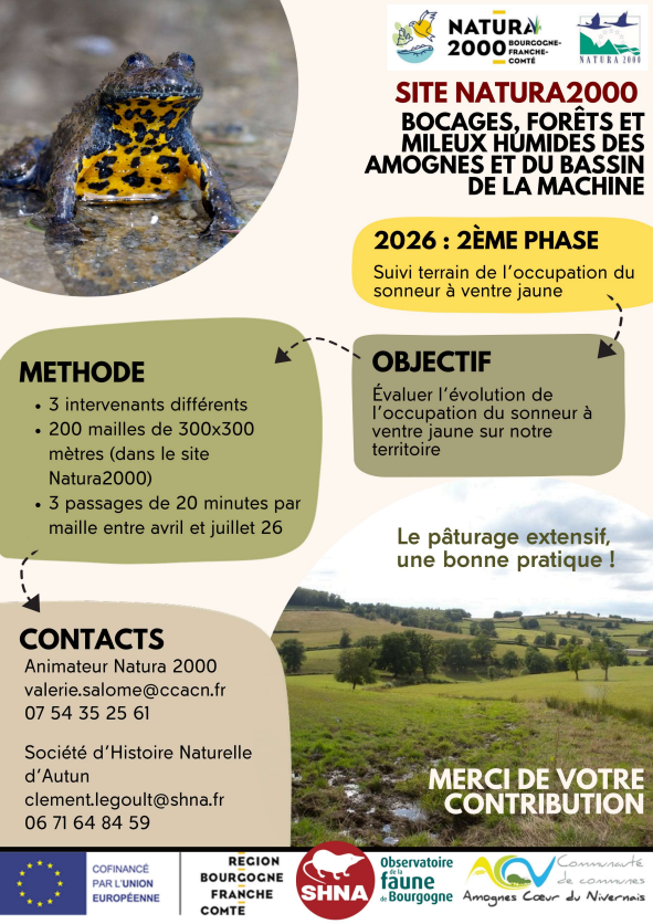 En 2026, un travail particulier est engagé sur les milieux humides, avec notamment le suivi du Sonneur à ventre jaune, réalisé par la Société d’Histoire Naturelle en collaboration avec l’animation Natura 2000 (un premier suivi avait été mené en 2023).
